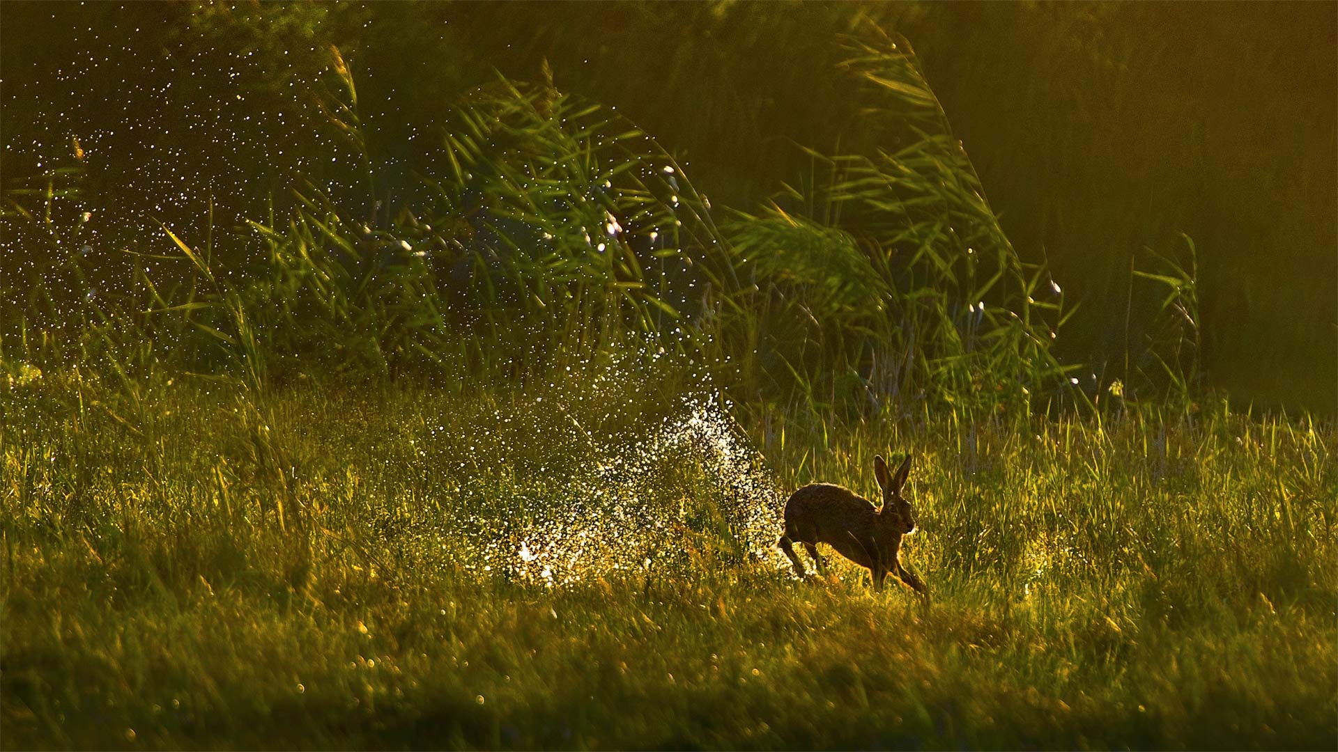 A European hare jumps through a wetland in the Netherlands (© Jim Brandenburg/Minden Pictures)